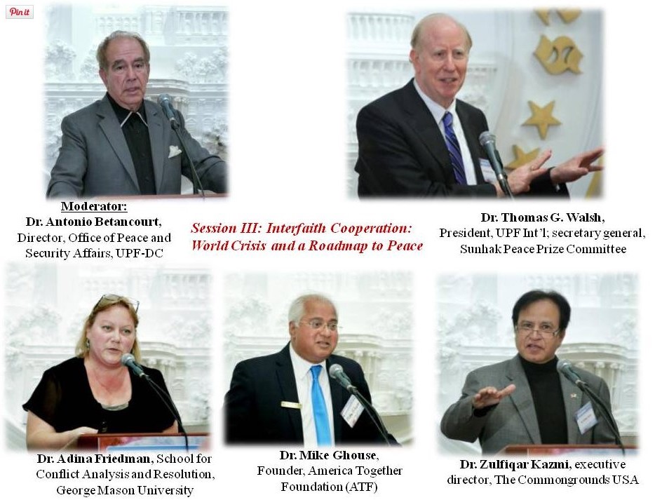 Dr. Mike Ghouse, founder, America Together Foundation (ATF). Dr. Ghouse’s recent book on human rights, Standing Up for Others, was influenced by Rev. Dr. Moon’s lifelong motto “To Live for the Sake of Others.” Many of the problems that exist between ethnic or religious groups are due to a lack of communication, miscommunication or that we learn about each other by listening to third parties and “talking heads.” He spoke about the “Unity Day” programs that his organization hosts to bring together people of all backgrounds and ethnicities and to break down the walls and barriers that tend to divide us. “We are in conflict because we don’t know each other.” He gave the example that if you walk in a neighborhood of ethnic foreigners, you might feel anxious or frightened, yet if just one person greets you, then the tension immediately dissipates. “Better communication is what’s needed. Communication goes both ways. Communication is as much about listening as it is about talking. Don’t be scared to reach out to someone else. Respect the other person, even if they have a different background, language or faith.” All faiths have salutations which encourage a positive message. Hindus: “Namaste,” Jews: “Shalom,” pagans: “Hail to Mother Earth,” Muslims: “Salaam Alaikum,” Christians: “Peace be with you.” “Religion is not the problem,” he said. “It’s how the individual practices that religion. He created each of us to be unique, and therefore He gave us each a unique DNA and wants us each to relate to Him.”