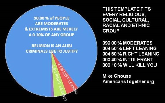 90% of people of any group are moderates, and do get along with others. 4.5% each is liberal and conservative, then there is 10th of 1% who are intolerant. No religion or group of people are free from that tiny group of people.