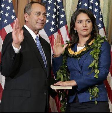 Rep. Tulsi Gabbard, the first Hindu in Congress, participates in a ceremonial swearing-in administered by Speaker of the House Rep. John Boehner.