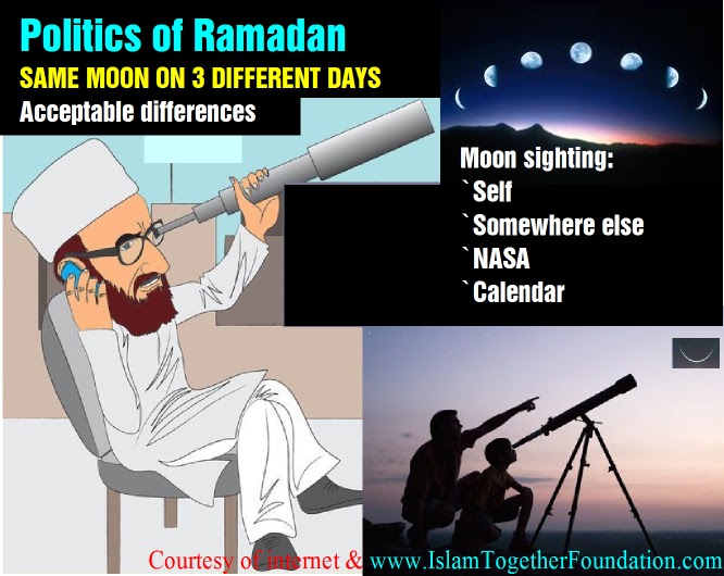 Politics plays a crucial role in our Temples, Synagogues or Churches, Mosques are no different. A few scientifically-inclined-Muslims have adopted NASA’s calculations believed to be precise. However, four different traditions are operating concurrently; i) Strictly Calendar, ii) NASA and iii) Sighting with bare eyes and iv) sighting by others in the community.