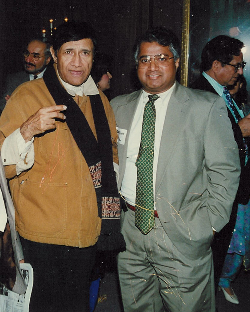 | Dev Anand and Mike Ghouse, someone was holding the Special edition of Asian News for Deve Anand. |